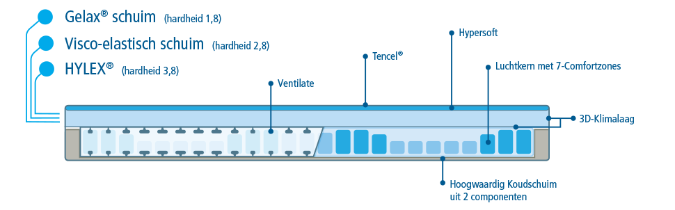 De 7-Comfortzones van de luchtkern zijn ieder afzonderlijk en in verschillende hoogte gevuld met hoogwaardig koudschuim.