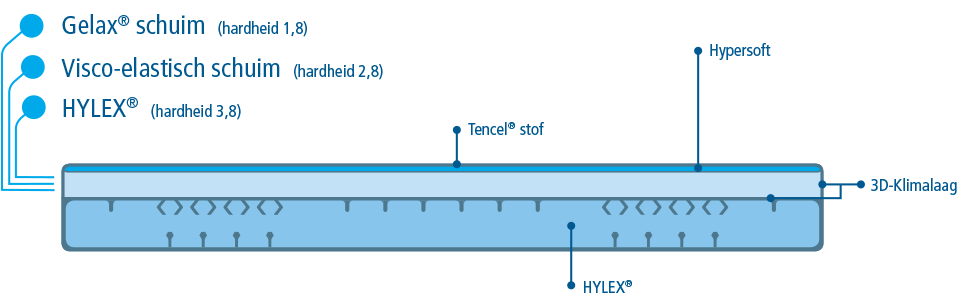 Ervaar de bijzondere eigenschappen van de Tribrid® Solid matras. De innovatieve matraskern is gemaakt van hoogelastisch, HYLEX® Premium Koudschuim met een open celstructuur voor een uitstekende ventilatie en daardoor een voortreffeljke regulatie van uw lichaamswarmte. De juiste keuze voor de beheersing van het klimaat in uw matras. HYLEX® zorgt voor een optimale ondersteuning omdat het een zeer veerkrachtig koudschuim is.